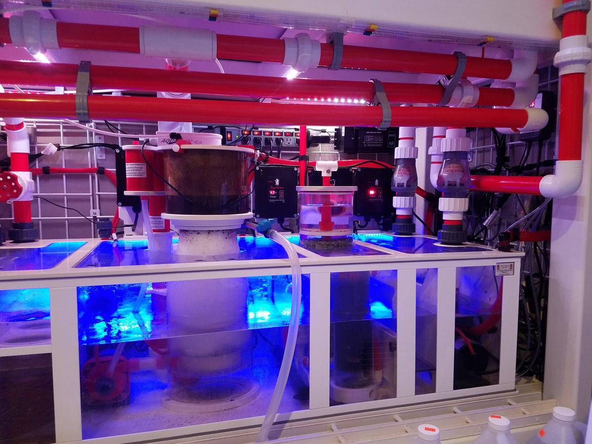 Cjevovod povezuje glavni akvarij sa sumpom te usmjerava protok vode kroz opremu kao što su skimmer, reaktori, UV uređaji i grijači. Obično ga čine sljedeći elementi: