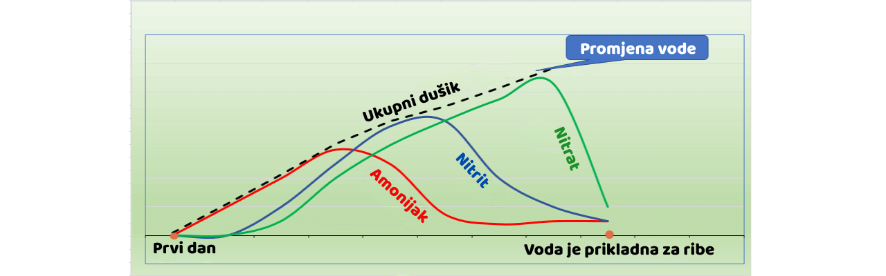 Uspostava dušikovog ciklusa temelj je zdravog slatkovodnog akvarija i prvi proces koji mora proći svaki novi sustav. Cikliranje znači biološku kolonizaciju filtra i supstrata nitrifikacijskim bakterijama koje razgrađuju toksični amonijak u nitrit, a zatim u znatno manje škodljiv nitrat. Te se bakterije razvijaju polako, pa akvarij u početnoj fazi izgleda naizgled »prazan«, ali se u njemu u pozadini gradi cijela biološka infrastruktura. Obično traje 4–6 tjedana, ako ne koristimo ubrzivače poput već utečenih filtracijskih medija iz aktivnog akvarija ili kvalitetnih bakterijskih pripravaka.