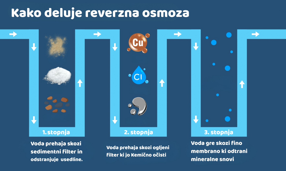 Reverzna osmoza je postupak pri kojem voda pod pritiskom prolazi kroz vrlo finu polupropusnu membranu. Membrana zadržava 95–99 % otopljenih tvari: soli, minerale, metale, organske spojeve, pesticide, nitrate, fosfate, klor, kloramin, mikroplastiku i većinu drugih nečistoća. Rezultat je gotovo potpuno čista voda s vrlo niskim TDS-om, po potrebi dodatno pročišćena i deionizacijom (DI), koja uklanja preostale ione i izlaznu vrijednost snižava na potpunih 0 TDS.